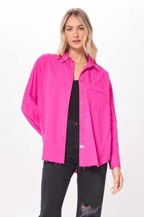 Make a bold style statement with this vibrant hot pink poplin button-up shirt, featuring a crisp tailored design that delivers polished versatility. Made from smooth, breathable poplin fabric, it includes a practical front pocket and a contemporary frayed hem for modern flair. Ideal for elevating your everyday wardrobe with a perfect balance of sophistication and casual charm.