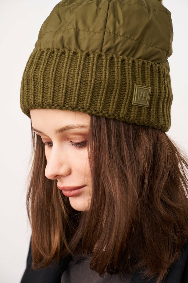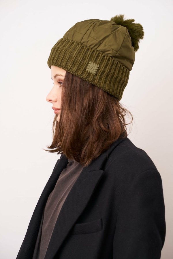 - Quilted nylon puffer POM hat with rib cuff
