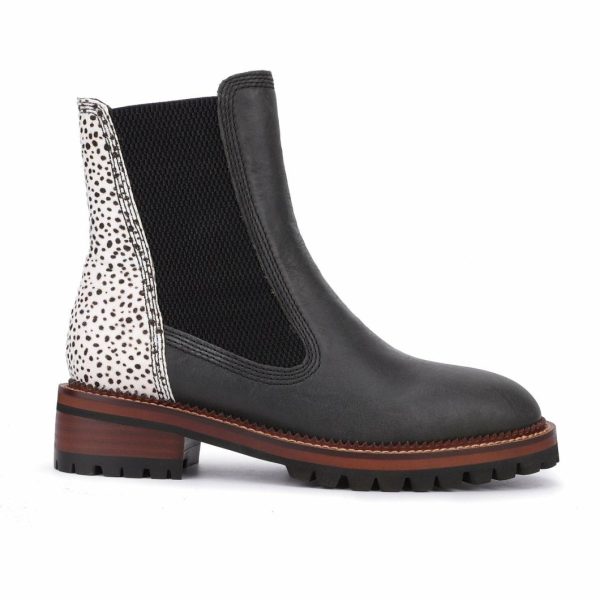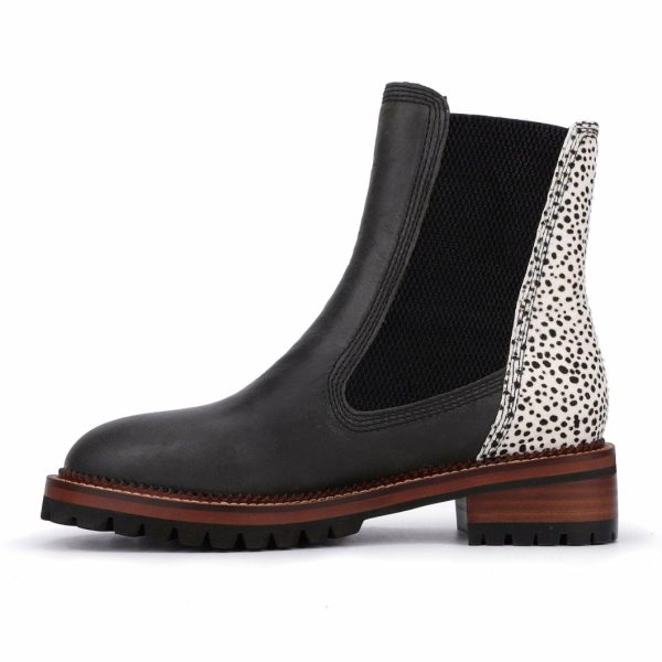 The Fairview Black Wild Cheetah slide-on bootie combines synthetic, leather, and suede materials for a stylish and durable finish. Designed to fit true to size, it offers easy wear and a comfortable fit, making it a versatile addition to your footwear collection. Perfect for elevating both casual and polished looks with effortless style.