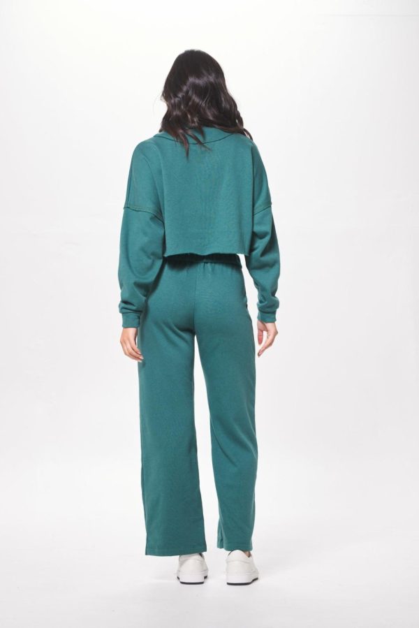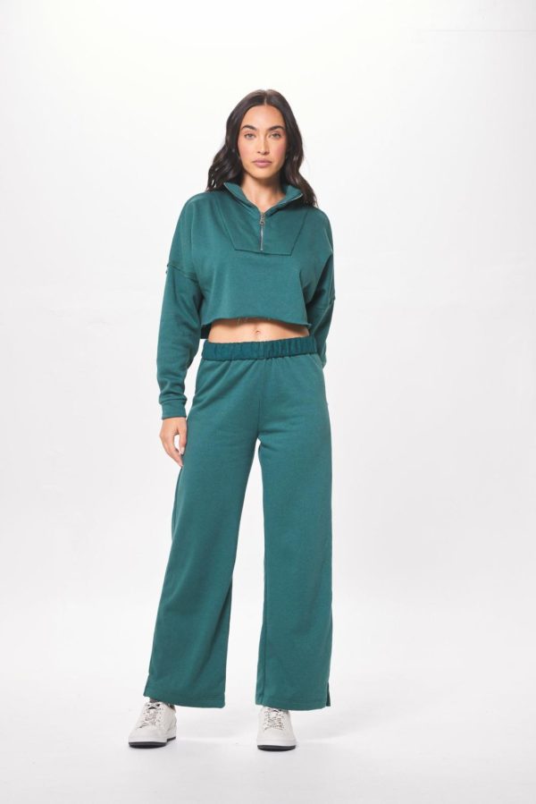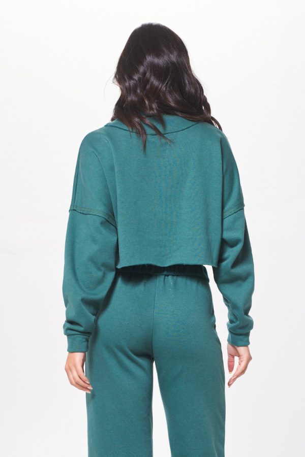 Stay comfortable and stylish with the Hunter Green Fleece Quarter Zip featuring a raw edge detail. This cropped sweatshirt offers a modern fit with a convenient quarter zip, perfect for layering or wearing on its own. Its soft fleece fabric ensures warmth without bulk, making it an ideal choice for casual outings or relaxed days.