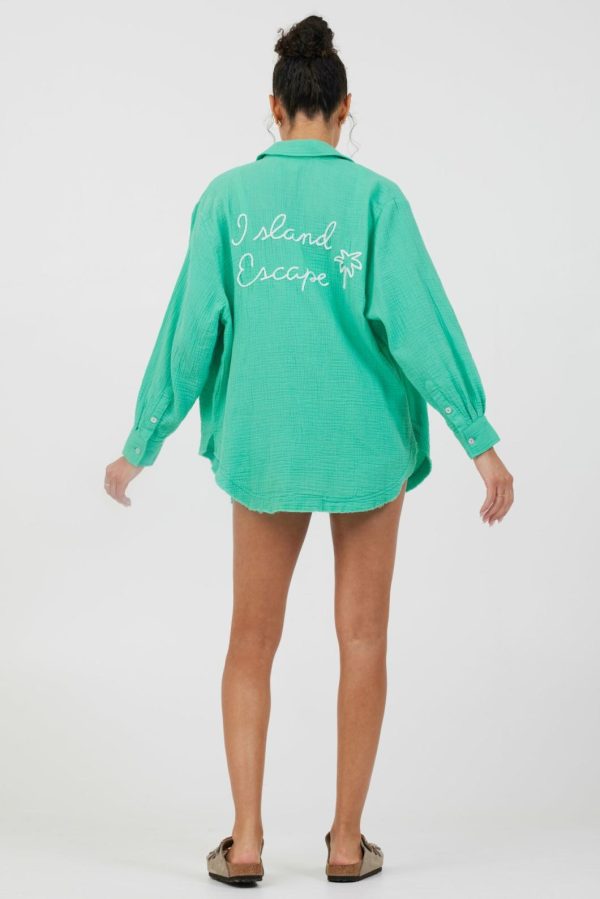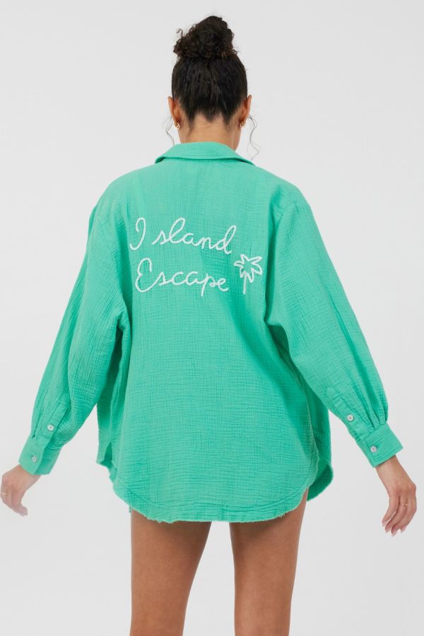 The Super Green/ Soft Ivory Embroidery Detail Gauze Shirting features: