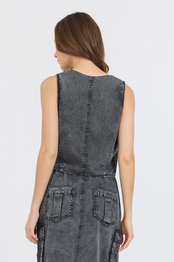 The Washed Black Twill Button Front Vest Top offers a stylish cropped fit that layers effortlessly over your favorite shirts or dresses. Crafted from durable twill fabric, this vest combines a classic button-front design with a modern silhouette, making it a versatile addition to your wardrobe for both casual and polished looks.