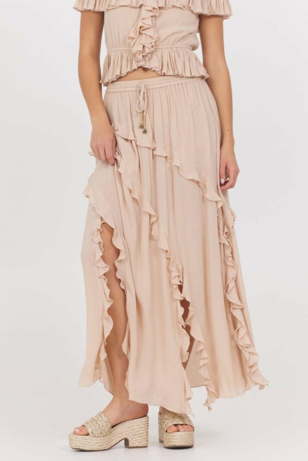 Our Champagne Toast Ruffle Maxi Skirt features elegant ruffle accents and a beautifully flowing silhouette that creates a sophisticated, feminine appearance. Ideal for both everyday wear and special events, this skirt delivers effortless elegance and all-day comfort. The dynamic design adds graceful movement and timeless charm, making it a versatile staple for your wardrobe.