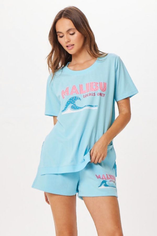 Experience effortless style with our Tropical Blue Malibu Jet Setter T-Shirt, featuring a convenient front zip and eye-catching “Malibu Locals Only” graphic that captures California cool. Sparkling gem accents add a touch of luxury to this versatile piece, perfect for both relaxation and casual outings.
